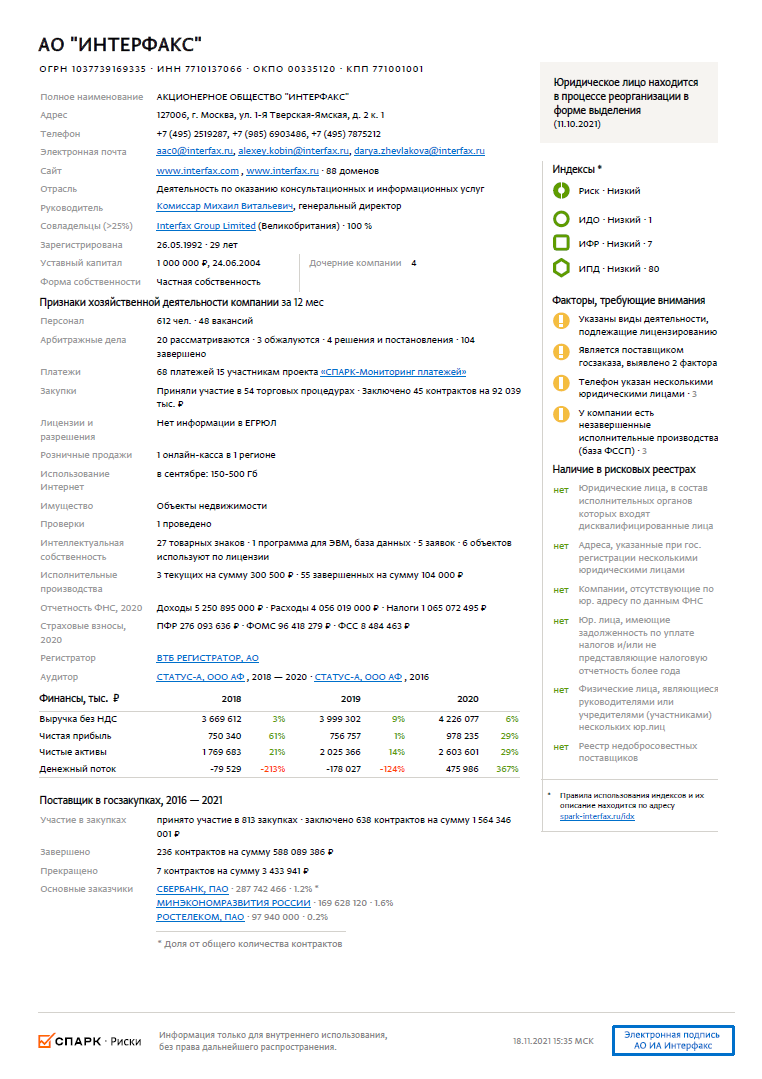 Справка содержит ключевые факторы деятельности юридического лица, на которые следует обратить внимание при принятии решения о сотрудничестве: