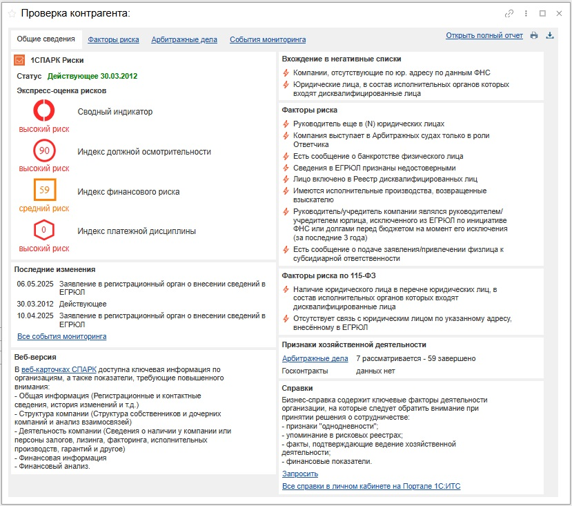 Карточки СПАРК открываются из программы 1С в веб-браузере. В СПАРКе доступна ключевая информация по компаниям или персонам, а также показатели, требующие повышенного внимания: